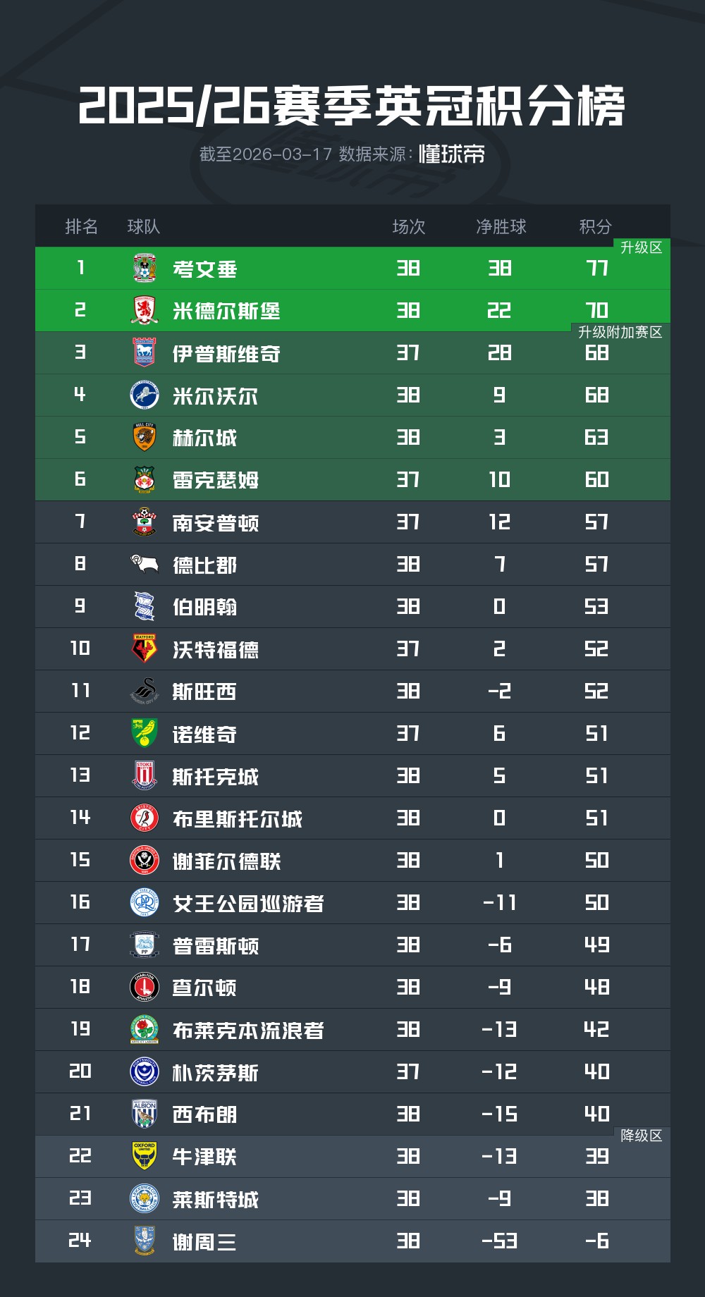 本賽季英冠聯(lián)賽保級形勢中,除已經(jīng)確定降級的謝周三之外,萊斯特城、牛津聯(lián)、西布朗、樸茨茅斯以及布萊克本均有降級風險。余下的聯(lián)賽輪次中,萊斯特城在和保級直接競爭對手的“6分戰(zhàn)”比賽中,僅剩下第43輪對陣樸茨茅斯和末輪對陣布萊克本的比賽。