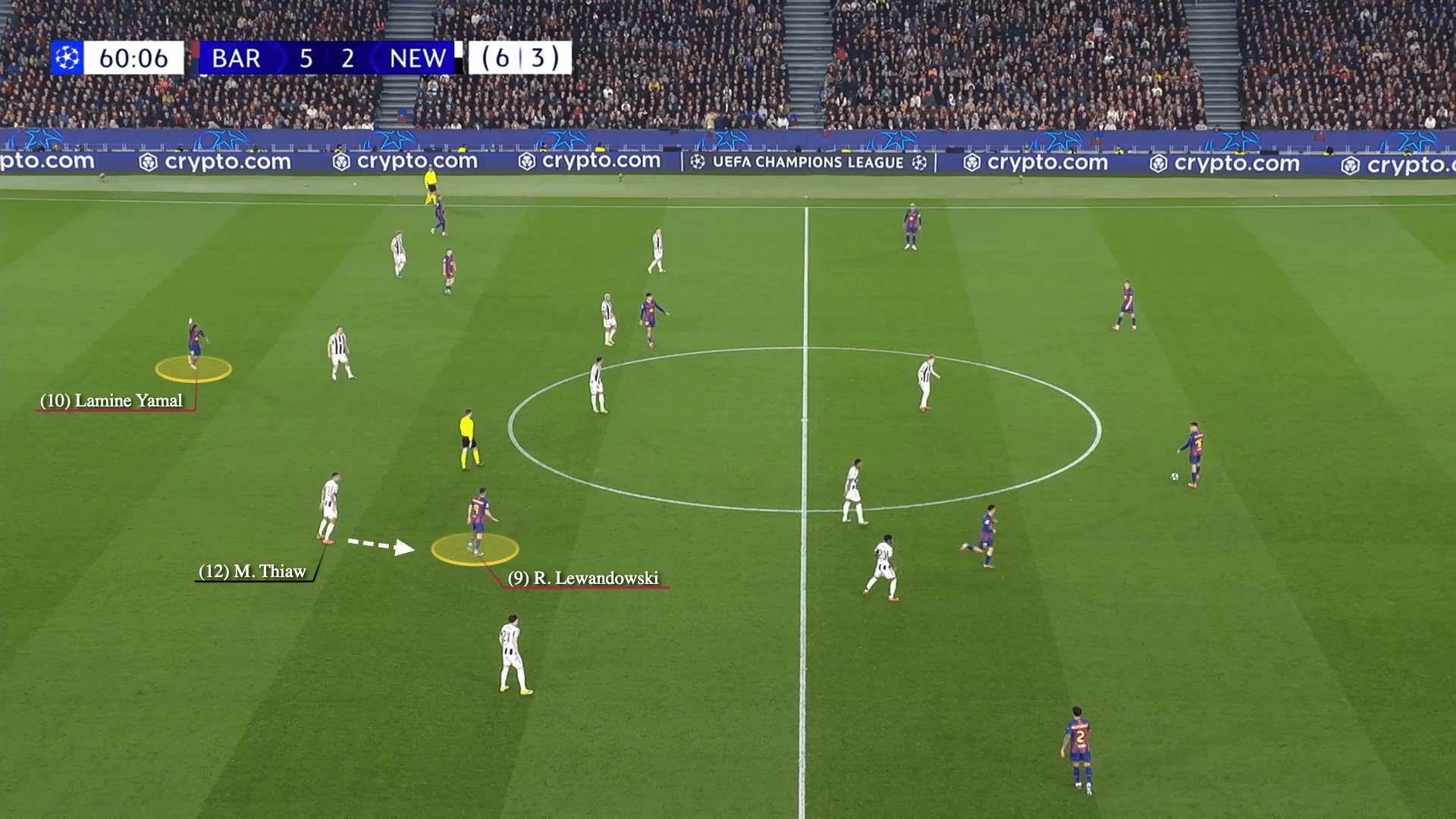 巴薩的第六粒進(jìn)球,更是將紐卡防線攪得混亂不堪。馬丁觀察進(jìn)攻選擇時,萊萬再度深度回撤,這次蒂奧切換防守目標(biāo)盯防波蘭前鋒;處于越位位置的亞馬爾舉手要球,吸引了伯恩的注意力。