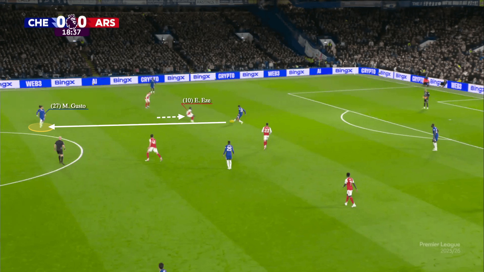 本賽季11月馬雷斯卡執(zhí)教的切爾西,也曾用這套方式1-1逼平阿森納:控球時讓福法納客串右后衛(wèi),詹姆斯與古斯托交替換位,硬生生撕開了阿森納的逼搶體系。