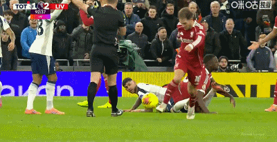 第33分鐘,哈維-西蒙斯踩踏范戴克小腿,VAR確認后被紅牌罰下,熱刺少一人作戰(zhàn)!