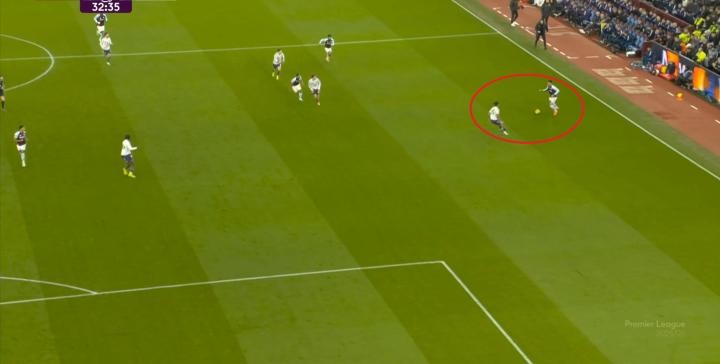 比賽第33分鐘,維拉在后場輕松起腳,沃特金斯和隊友在海文和烏加特的身上打出并保住優(yōu)勢,從而將球權(quán)轉(zhuǎn)給了邊路的羅杰斯,讓他有了和約羅一對一的機會: