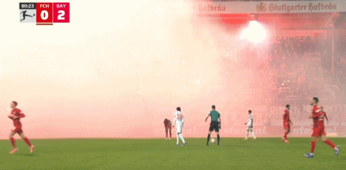 第80分鐘,拜仁球迷燃放煙火導(dǎo)致場內(nèi)煙霧彌漫,比賽一度暫停